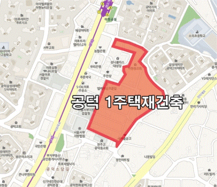 공덕 1 구역 단독주택 재건축 단지입니다. 단독주택 재건축으로 일반분양 물량이 많습니다. 1101세대 중 일반분양 463세대입니다.