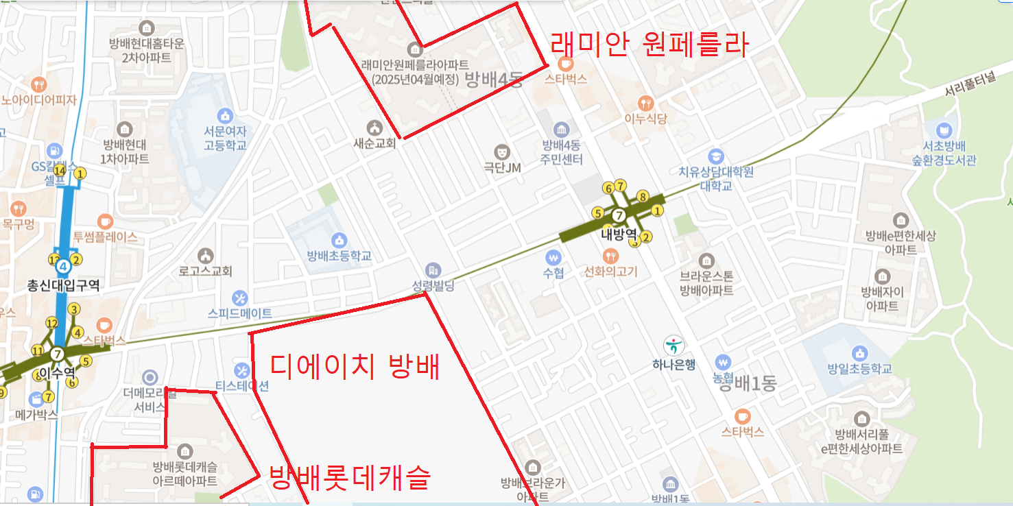 - 2호선 방배역 차로 5~10분 거리